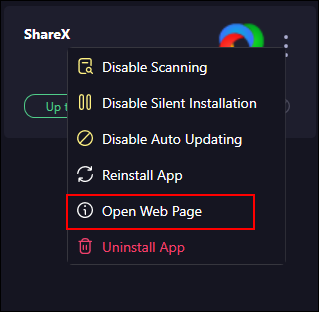 We released an update today (version 5.3.0.0) that will show an "Open Web Page" button in the applications hamburger menu. This will only be clickable if the application has a help link in it's add and remove programs. Here's what it looks like for ShareX for example. Here's the full release notes https://patchmypc.com/release-notes/production-release/home-updater-releases/