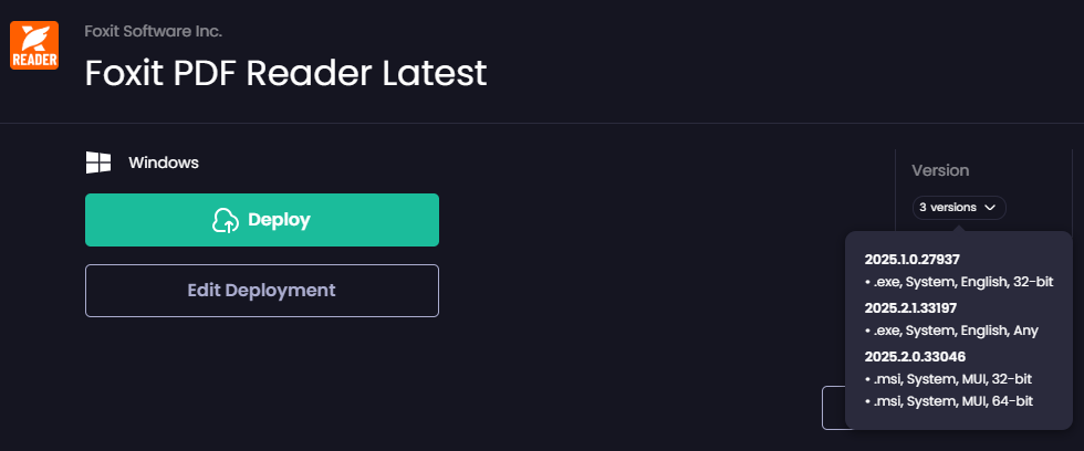 Now we want to add the same software with version 1.2 without it being deployed automatically at the MSP customers but we'd like to choose at the msp customer level to deploy either version 1.1 or 1.2 (as we can for example with the PMPC Foxit PDF Reader Latest, see attached pic).