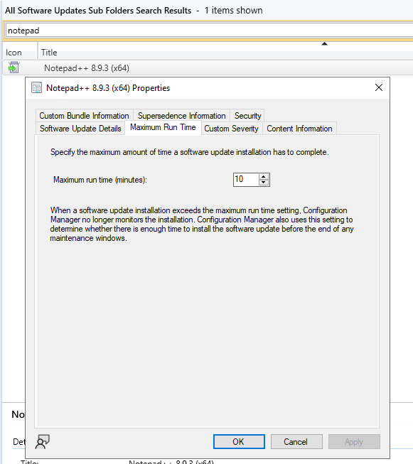 I’d like to suggest an idea regarding how the Maximum Run Time is handled for applications and software updates in SCCM. For instance, if Notepad++ version 8.9.2 is already configured in SCCM with a Maximum Run Time of 240 minutes, I’ve noticed that when a new version is uploaded and configured, this setting reverts to the default value of 10 minutes. Is there a way to ensure that the Maximum Run Time remains at 240 minutes for new versions or updates, rather than resetting to the default each time?